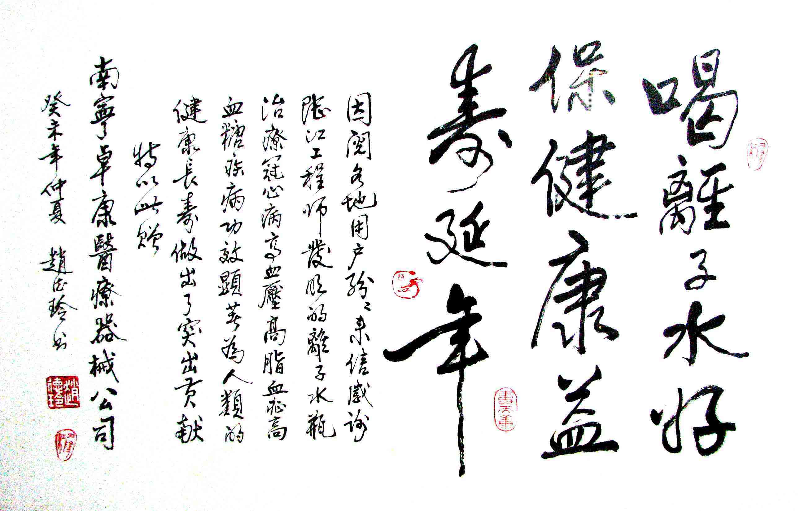 ---本品處理水用核磁共振測(cè)定值為55.82Hz(赫茲),為富含4-6個(gè)水分子小簇團(tuán)的微小分子團(tuán)水,可與世界各地長(zhǎng)壽村水媲美。本品曾經(jīng)三家省級(jí)醫(yī)院做臨床觀察,經(jīng)北京和廣西醫(yī)學(xué)專(zhuān)家鑒定,22年來(lái)對(duì)以上病癥承諾療效,大量原發(fā)性高血壓患者飲用4至6個(gè)月內(nèi)停藥,血壓正常穩(wěn)定,癥狀消除,逐漸逆轉(zhuǎn)至消除動(dòng)脈粥樣硬化;冠心病患者在3至5個(gè)月內(nèi)逐漸減輕至消除心痛胸悶,一年左右痊愈,心腦電圖正常。這是根據(jù)中國(guó)基礎(chǔ)醫(yī)學(xué)研究成果和生命科學(xué)原理轉(zhuǎn)化為醫(yī)學(xué)應(yīng)用的杰出成果,使人從細(xì)胞到器官發(fā)展至全身健康。2型糖尿病患者使用3-10月內(nèi)痊愈。中風(fēng)后遺癥患者7-10個(gè)月改善至消除肢體和語(yǔ)言障礙。用戶(hù)最新報(bào)告:尿毒癥患者飲用兩個(gè)月,指標(biāo)已經(jīng)大為改善,適合腎衰和透析者使用。以上均為史無(wú)前例的轉(zhuǎn)化醫(yī)學(xué)應(yīng)用,產(chǎn)品壽命30年,不換芯。